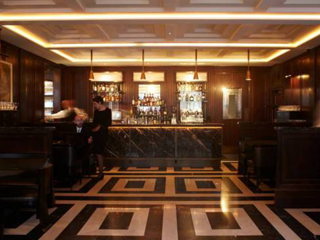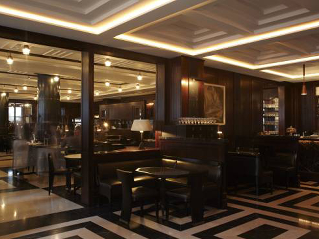 One of the most striking features of the restaurant is the chequerboard marble floor below the feature ceilings, set against the background of dark stained oak wall panelling embellished with aged bronze metalwork and gold leaf detailing.